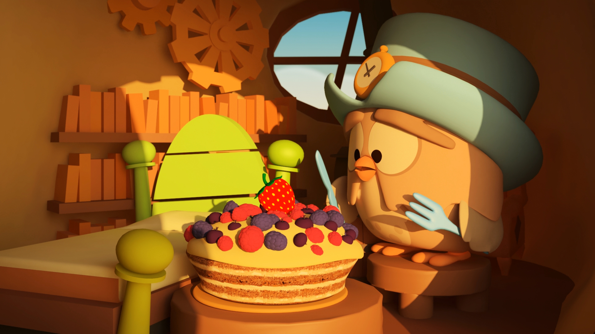 È un gufo fifone e permaloso, sempre assonnato. Vive nella casetta-orologio ricavata all’interno di un maestoso albero. Scandisce il passare delle ore come un orologio a cu-cù e spesso interpreta gli umori del villaggio. Va pazzo per i dolci.